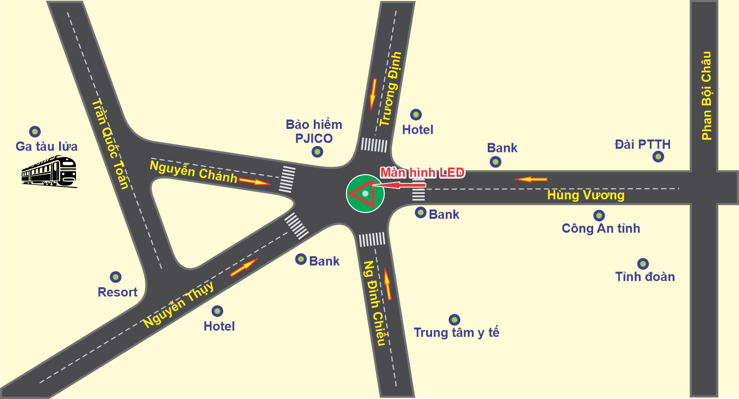Màn hình LED được đặt ngay giữa Vòng xuyến Ngã 5 Thu Lộ (Đường Nguyễn Chánh, Nguyễn Thụy, Nguyễn Đình Chiểu, Hùng Vương và Trương Định). Đây là nút giao thông luôn đông đúc cả ngày lẫn đêm. Đối diện pano là quảng trường, xung quanh là nhà hàng, khách sạn, siêu thị, Ga trung tâm Quảng Ngãi… Vị trí màn hình LED nằm ngay điểm giao giữa các tuyến đường, mạng lưới giao thông dày đặc, sầm uất tạo điểm nhấn nổi bật cho sản phẩm quảng cáo tại đây.