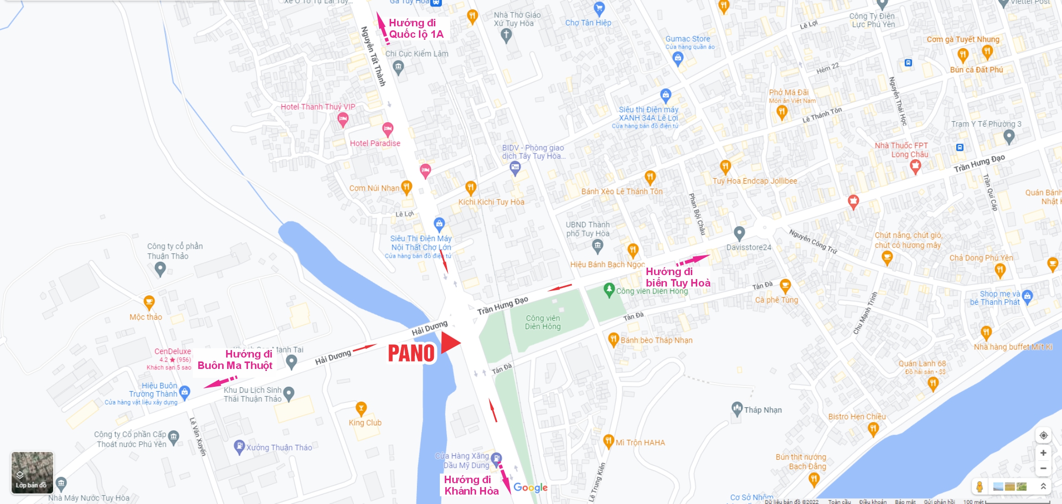 Pano nằm ngay tại ngã 4 Đ. Trần Hưng Đạo – Nguyễn Tất Thành – Hải Dương, phường Tuy Hòa. Xung quanh pano là siêu thị Điện máy, công viên, đài phát thanh truyền hình, ngân hàng, khu du lịch sinh thái,…Nên mật độ người qua lại nơi đây rất đông đúc, nội dung quảng cáo được tiếp cận đến nhiều đối tượng khách hàng. Một vị trí tiềm năng tạo nên hiệu quả quảng cáo rất cao.