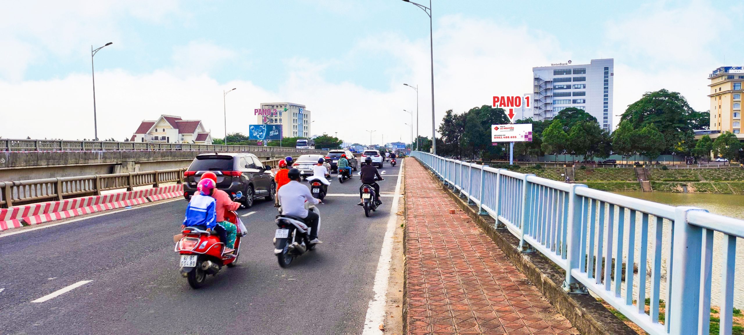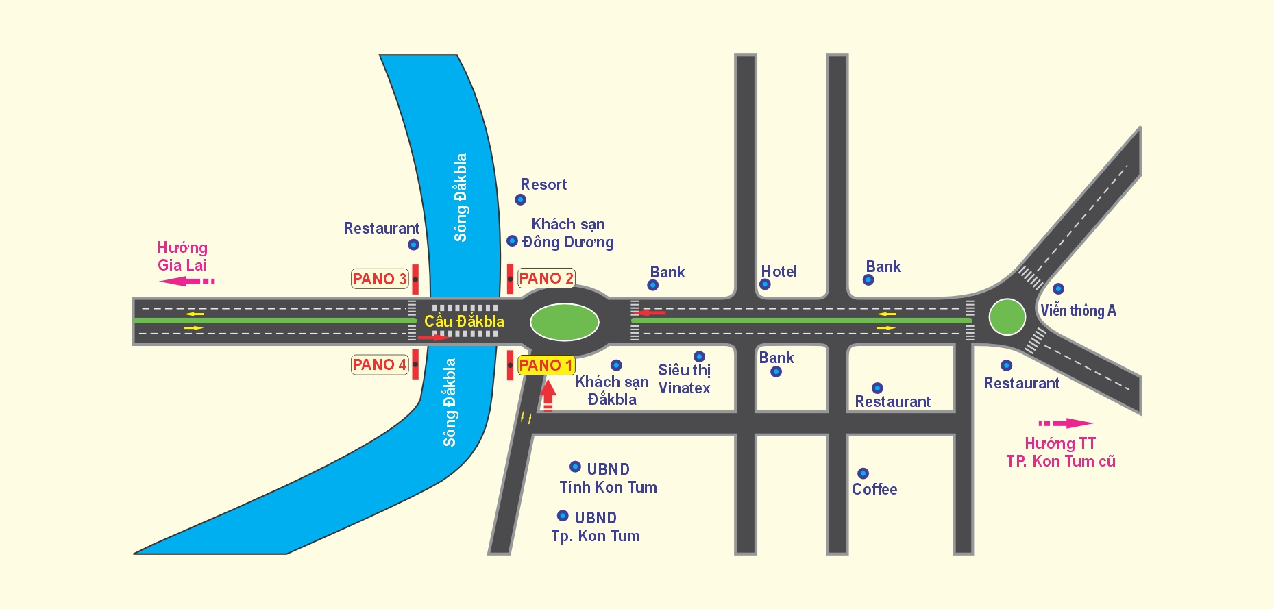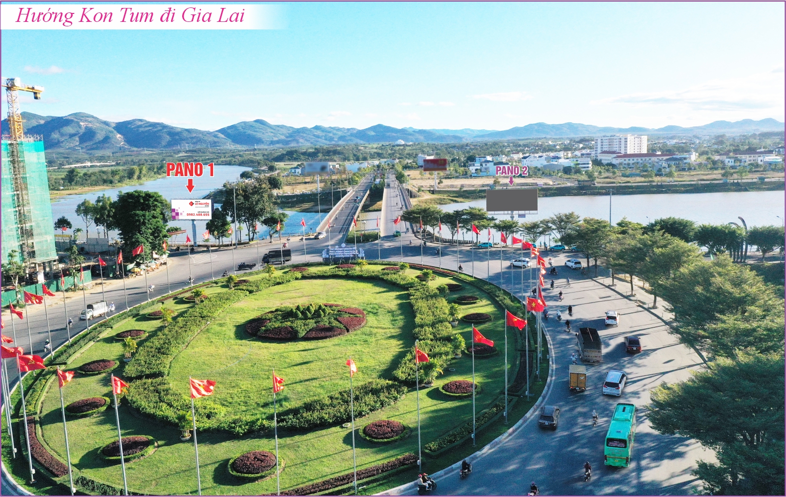 Pano 2 mặt được đặt ngay vị trí phía Bắc bên trái đầu cầu Đắk Bla đón hướng trung tâm P. Kon Tum cũ đi Gia Lai và ngược lại. Đây là cây cầu huyết mạch nối liền Quốc lộ 14 đi qua trung tâm P. Kon Tum cũ và các tỉnh Tây Nguyên. Nơi tập trung dân cư đông đúc, cửa hàng kinh doanh, các ngân hàng tài chính, cơ quan ban ngành, chợ, Quảng trường, khách sạn… Nên lưu lượng tham gia giao thông qua lại khu vực này tấp nập. Pano là điểm nhấn khi khách qua cầu, tạo hiệu quả quảng cáo rất cao.