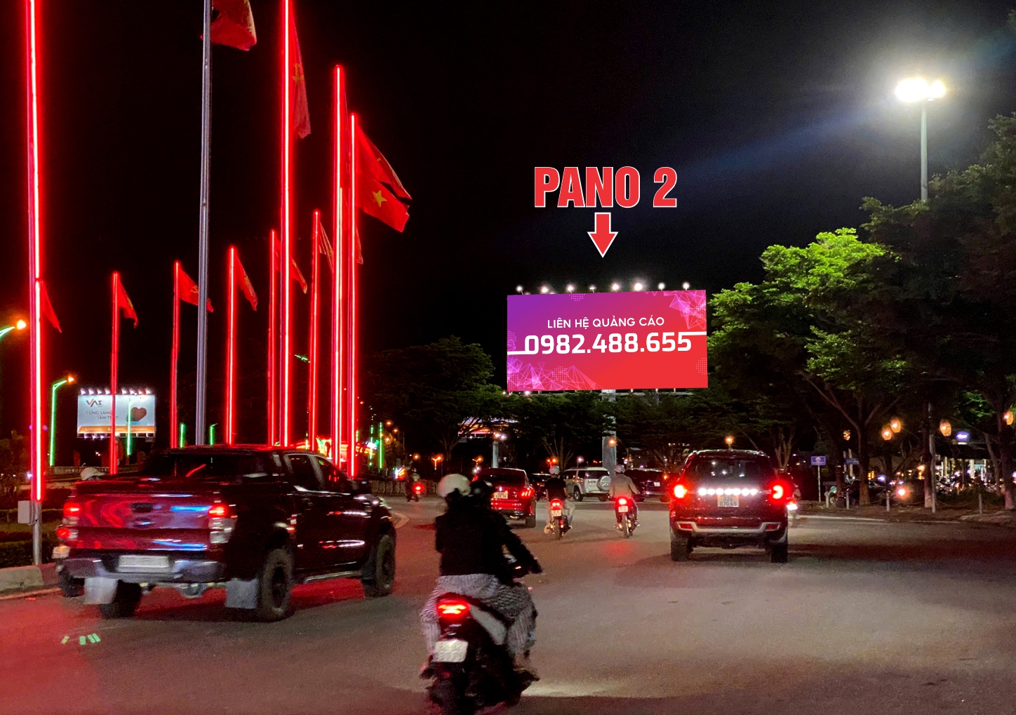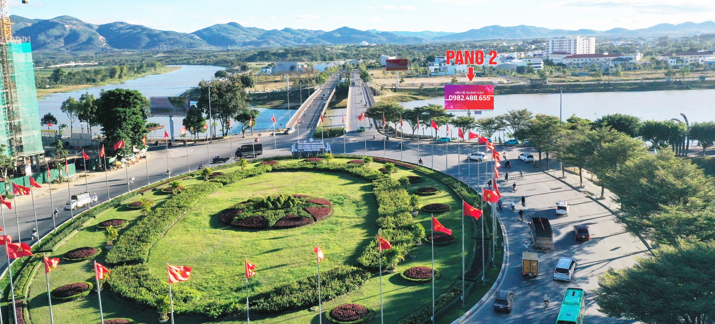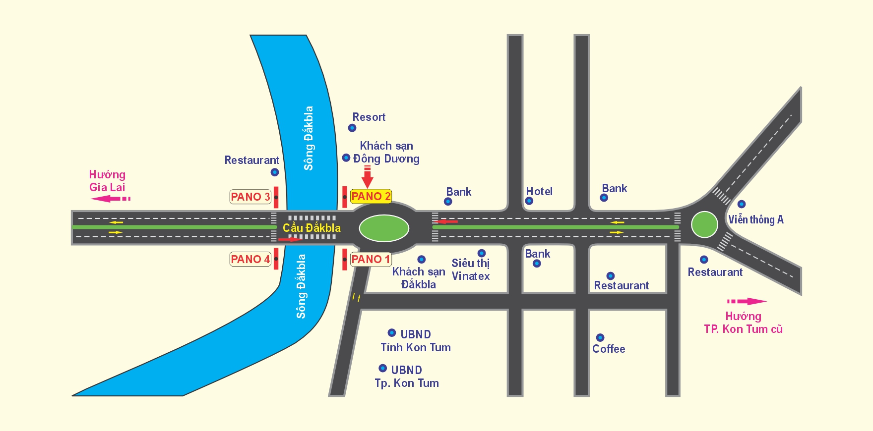 Pano 2 mặt được đặt ngay vị trí phía Bắc bên phải đầu cầu Đắk Bla đón hướng trung tâm P. Kon Tum cũ đi Gia Lai và ngược lại. Đây là cây cầu huyết mạch nối liền Quốc lộ 14 đi qua trung tâm Kon Tum cũ và các tỉnh Tây Nguyên. Nơi tập trung dân cư đông đúc, cửa hàng kinh doanh, các ngân hàng tài chính, cơ quan ban ngành, chợ, Quảng trường, khách sạn… Nên lưu lượng tham gia giao thông qua lại khu vực này tấp nập. Pano là điểm nhấn khi khách qua cầu, tạo hiệu quả quảng cáo rất cao.