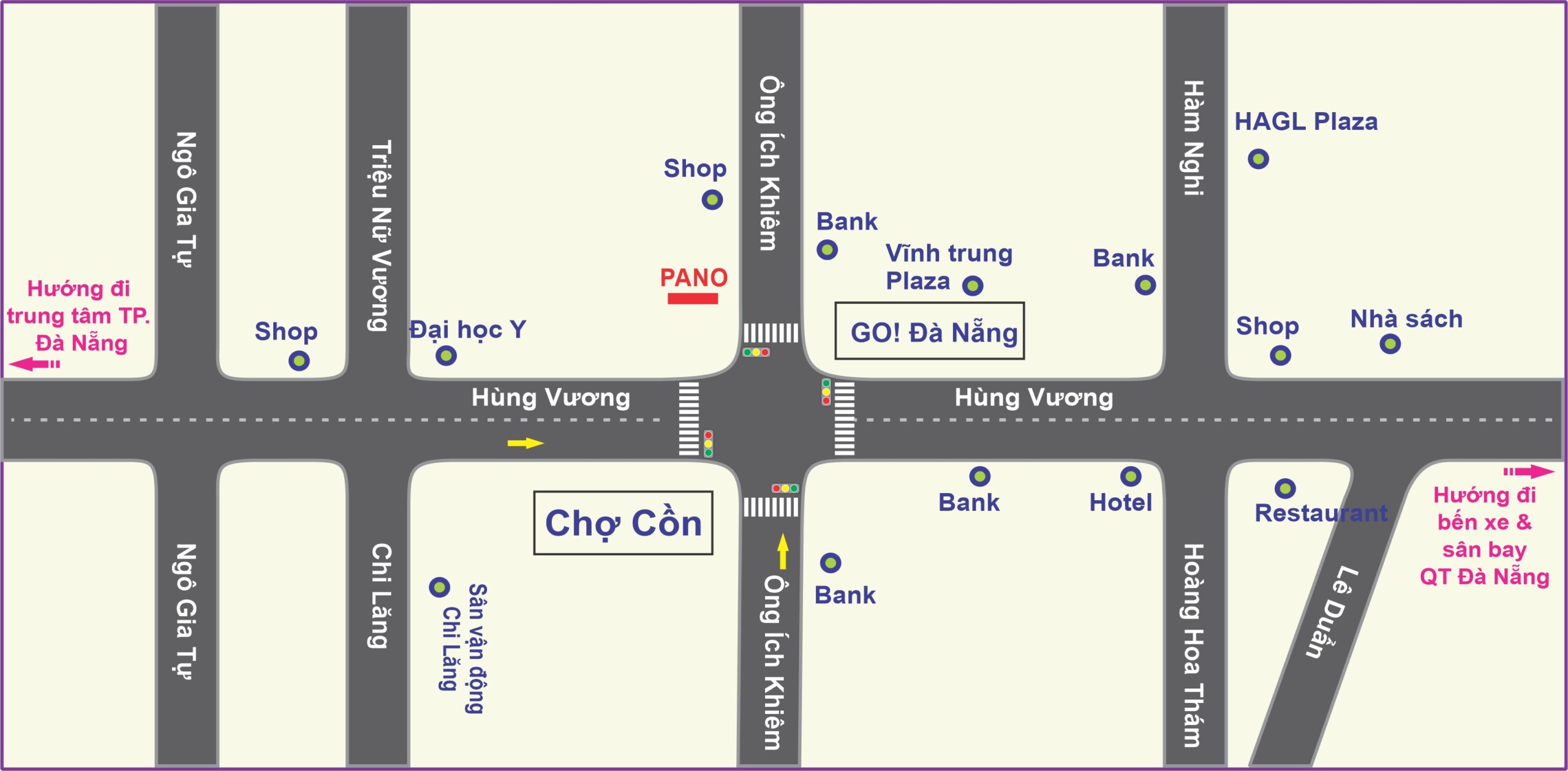 Pano nằm đối diện siêu thị GO! và tòa nhà văn phòng cho thuê của Vĩnh Trung Plaza, đối diện chợ Cồn, là địa điểm thương mại lớn nhất TP. Đà Nẵng. Vì vậy giao thông qua lại nơi đây rất đông đúc. Đặc biệt, pano nằm ngay tòa nhà hướng về phía đèn xanh đỏ, có tầm nhìn rất cưỡng bức. Đây là những tuyến đường chính dẫn đến trung tâm hành chính, trung tâm thương mại và khu du lịch nổi tiếng của TP… Đây là điểm nhấn nổi bật khi đặt sản phẩm quảng cáo tại đây.