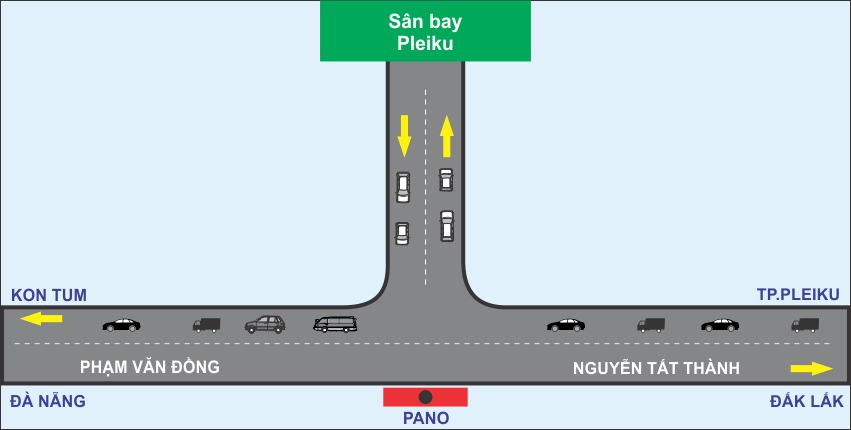 Pano nằm ngay tại ngã 3 đường vào sân bay Pleiku, tỉnh Gia Lai. Pano được thiết kế nằm độc lập và đón hướng giữa tim đường từ sân bay ra, khiến du khách qua lại không thể không ngắm nhìn. Đây chính là điểm nhấn nổi bật khi du khách vừa mới đặt chân đến Pleiku. Xung quanh là các khách sạn, công ty, khu mua sắm, nhà hàng,… Pano cũng đón khách qua lại hằng ngày trên tuyến đường QL.14B, nên lượng khách qua lại nơi đây rất đông. Điểm vàng để thương hiệu của bạn được truyền tải đến nhiều đối tượng người xem và tiêu dùng.