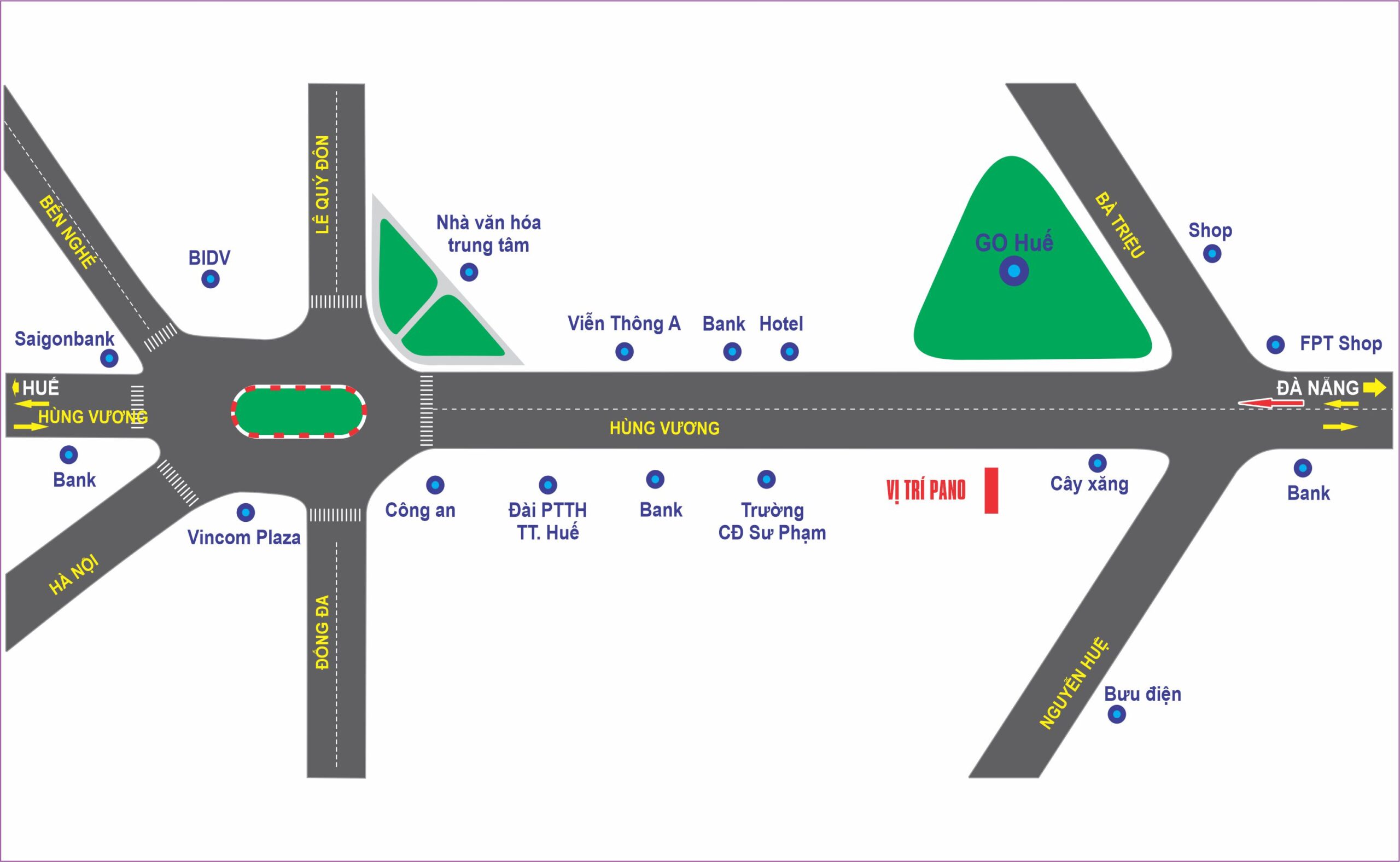 Pano nằm ngay trước mặt Siêu thị Go!, đón dòng người ra vào Siêu thị. Đặc biệt vị trí pano nằm ngay trung tâm, gần khách sạn, UBND, Trường Đại học… và đây là nơi có lượng khách rất đông từ các Tỉnh thành và Quốc tế về Du lịch Huế, nơi diễn ra các sự kiện lớn mang tầm Quốc tế như Festival Huế, các lễ hội khác… Mặt bảng pano đón khách từ Huế và các tỉnh phía Bắc vào, có tầm nhìn rộng và thoáng nên rất bắt mắt cho người đi đường, đem lại hiệu quả quảng cáo cao.