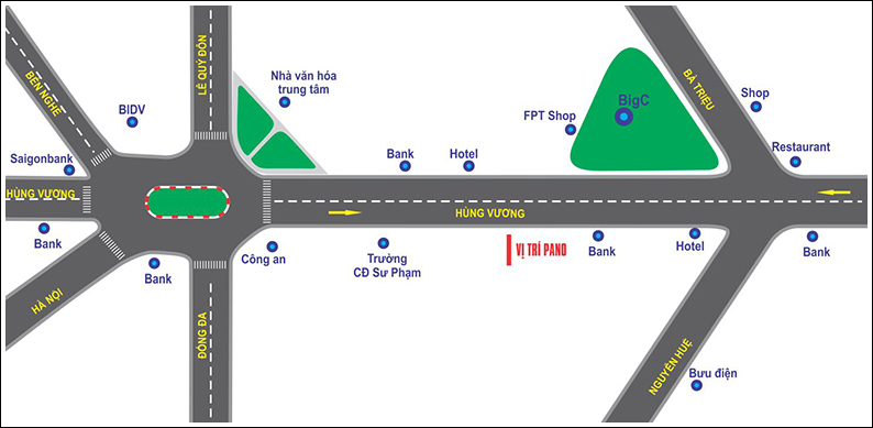 Pano nằm ngay trước mặt Siêu thị Go!, đón dòng người ra vào Siêu thị. Đặc biệt vị trí pano nằm ngay trung tâm, gần khách sạn, UBND, Trường Đại học… và đây là nơi có lượng khách rất đông từ các Tỉnh thành và Quốc tế về Du lịch Huế, nơi diễn ra các sự kiện lớn mang tầm Quốc tế như Festival Huế, các lễ hội khác… Mặt bảng pano đón khách từ Huế và các tỉnh phía Bắc vào, có tầm nhìn rộng và thoáng nên rất bắt mắt cho người đi đường, đem lại hiệu quả quảng cáo cao.