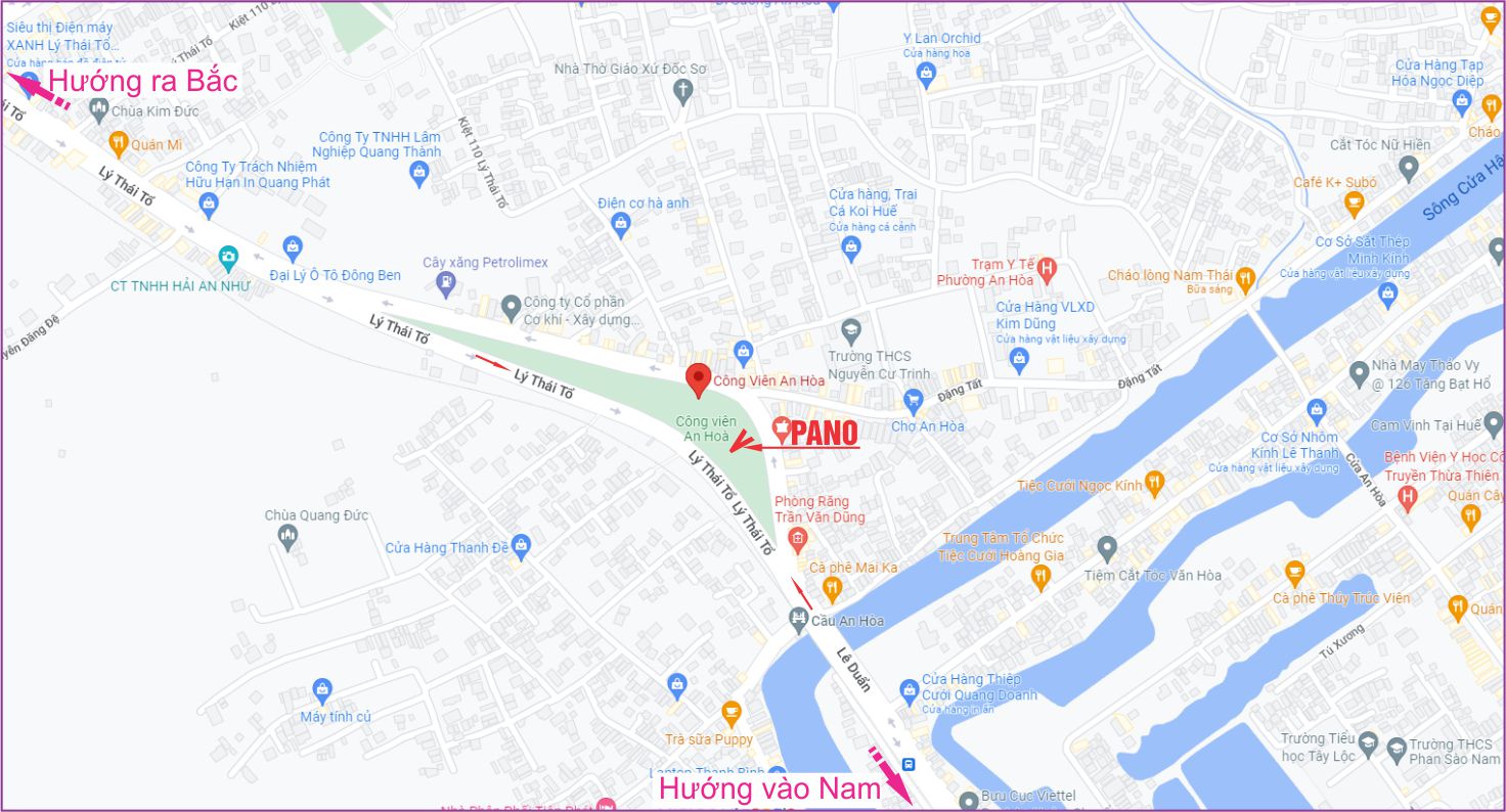Pano nằm ngay giữa công viên An Hoà, pano đón thẳng với tim đường, đón lượng người từ Bắc vào Nam và ngược lại … Đây là nơi có lượng khách rất đông từ các tỉnh thành và thế giới về du lịch, dự Festival Huế hàng năm. Xung quanh pano là phòng khám, trường học, siêu thị, bến xe phía Bắc, cây xăng, các nhà hàng, shop thời trang,… Vị trí pano nằm trên các tuyến đường huyết mạch của TP nên lưu lượng giao thông qua lại rất đông đúc, là điểm nhấn cho sản phẩm quảng cáo nơi đây.