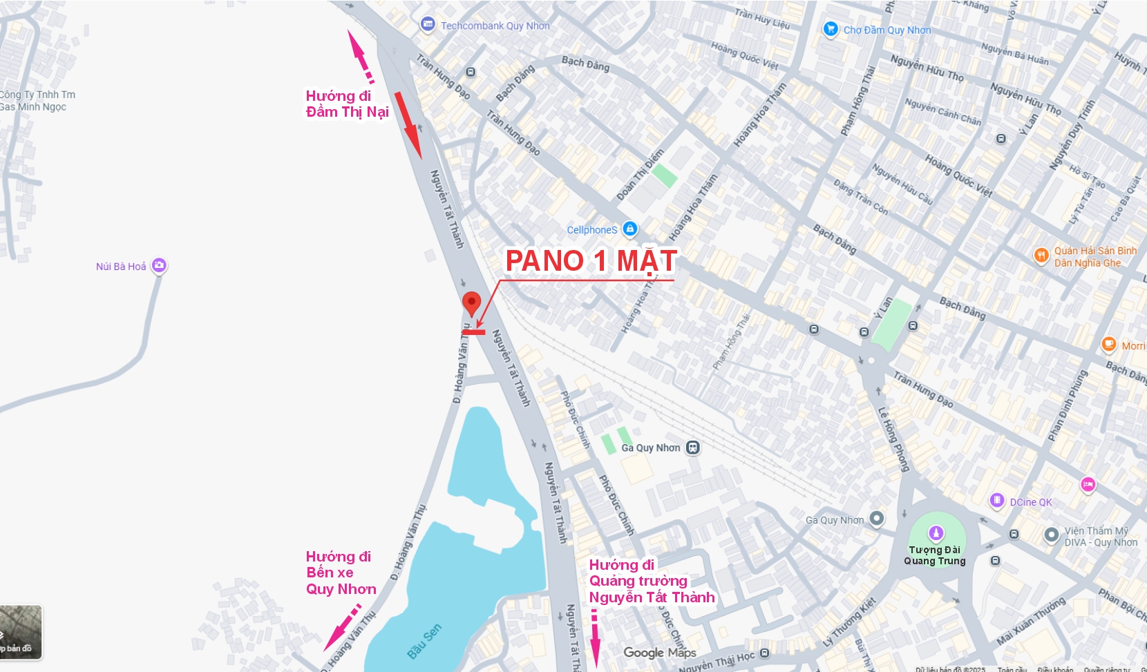 Pano nằm ngay góc công viên ngã 3 đường Nguyễn Tất Thành – Hoàng Văn Thụ, là trục đường chính đi vào trung tâm Quy Nhơn từ cửa ngõ phía Bắc. Đây là trục đường huyết mạch của tỉnh nên lưu lượng giao thông, du khách qua lại hàng ngày rất tấp nập. Xung quanh pano là khu dân cư đông đúc, siêu thị, khách sạn, nhà hàng, công viên và là khu vực tập trung phần lớn trụ sở các cơ quan ban ngành. Vì vậy hiệu quả quảng cáo mang lại là rất lớn khi thực hiện tại đây.