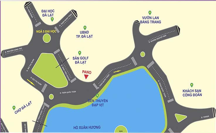 Pano nằm góc ngã 3 Trần Quốc Toản – Đinh Tiên Hoàng, đây là tuyến đường trung tâm chạy bao quanh bờ hồ Xuân Hương. Khu vực tập trung nhiều cơ quan ban ngành, khách sạn, nhà hàng, trường học, khu vui chơi, trung tâm văn hóa, sân Golf, ủy ban nhân dân, đặc biệt gần chợ đêm Đà Lạt nên tập trung mua sắm, thu hút nhiều khách du lịch…. Nên hằng ngày khách du lịch đi lại qua khu vực này đông đúc. Pano 2 mặt, có vị trí thoáng, đẹp, nhìn được nhiều hướng từ xa là điểm nhấn rất đẹp cho du khách nơi đây và mang lại hiệu quả Quảng cáo rất lớn
