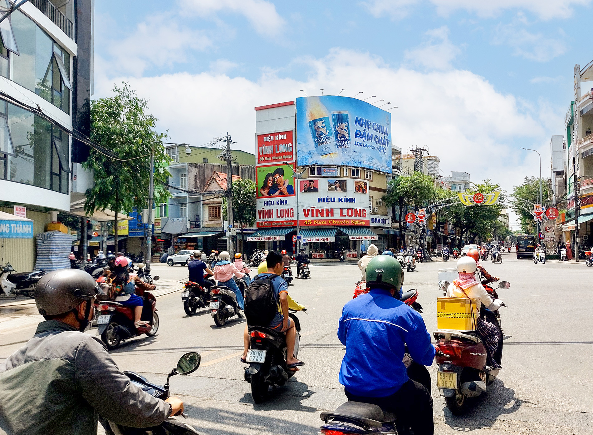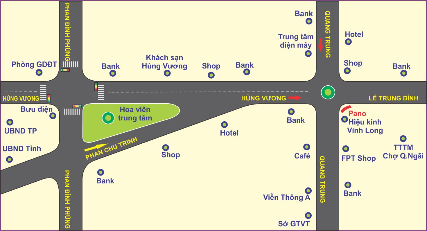 Pano ốp mặt tiền được đặt ngay góc ngã 4 Hùng Vương – Quang Trung là trục đường huyết mạch của Quảng Ngãi, nơi đây tập trung các cơ quan ban ngành, xung quanh là siêu thị, ngân hàng, khách sạn, công ty, công viên, UBND, bưu điện,… Nên lượng người qua lại rất đông đúc và sầm uất. Vị trí pano nằm ngay điểm giao giữa các tuyến đường tạo nên mạng lưới giao thông dày đặc, sầm uất tạo điểm nhấn nổi bật cho sản phẩm quảng cáo tại đây.