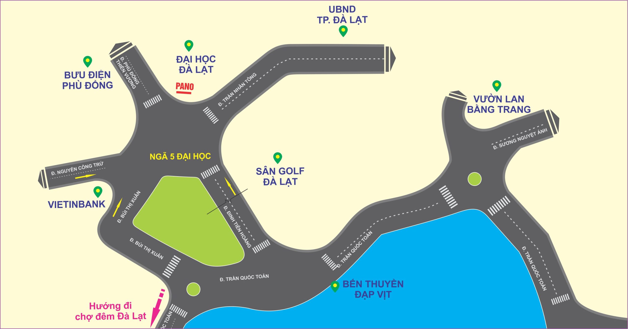 Pano 1 trụ mặt hướng về ngã 5 đón dòng người từ các tỉnh thành tới du lịch. Pano nằm ngay khu trung tâm du lịch bên cạnh trường Đại học Đà Lạt, gần UBND Đà Lạt, sân Golf, shop, ngân hàng… Đây là nơi giao nhau giữa các tuyến đường chính trong thành phố Đà Lạt cũ nên mật độ giao thông qua lại rất đông đúc, pano nằm trên cao, thẳng tim đường rất bắt mắt, đem lại hiệu quả quảng cáo cao.