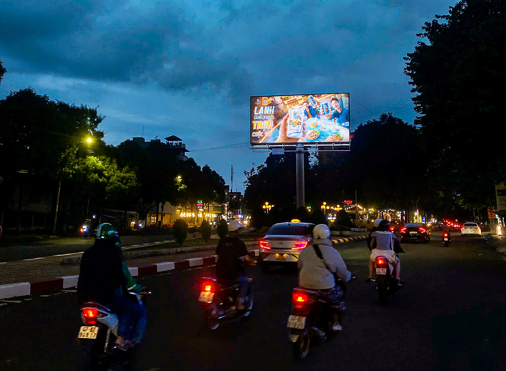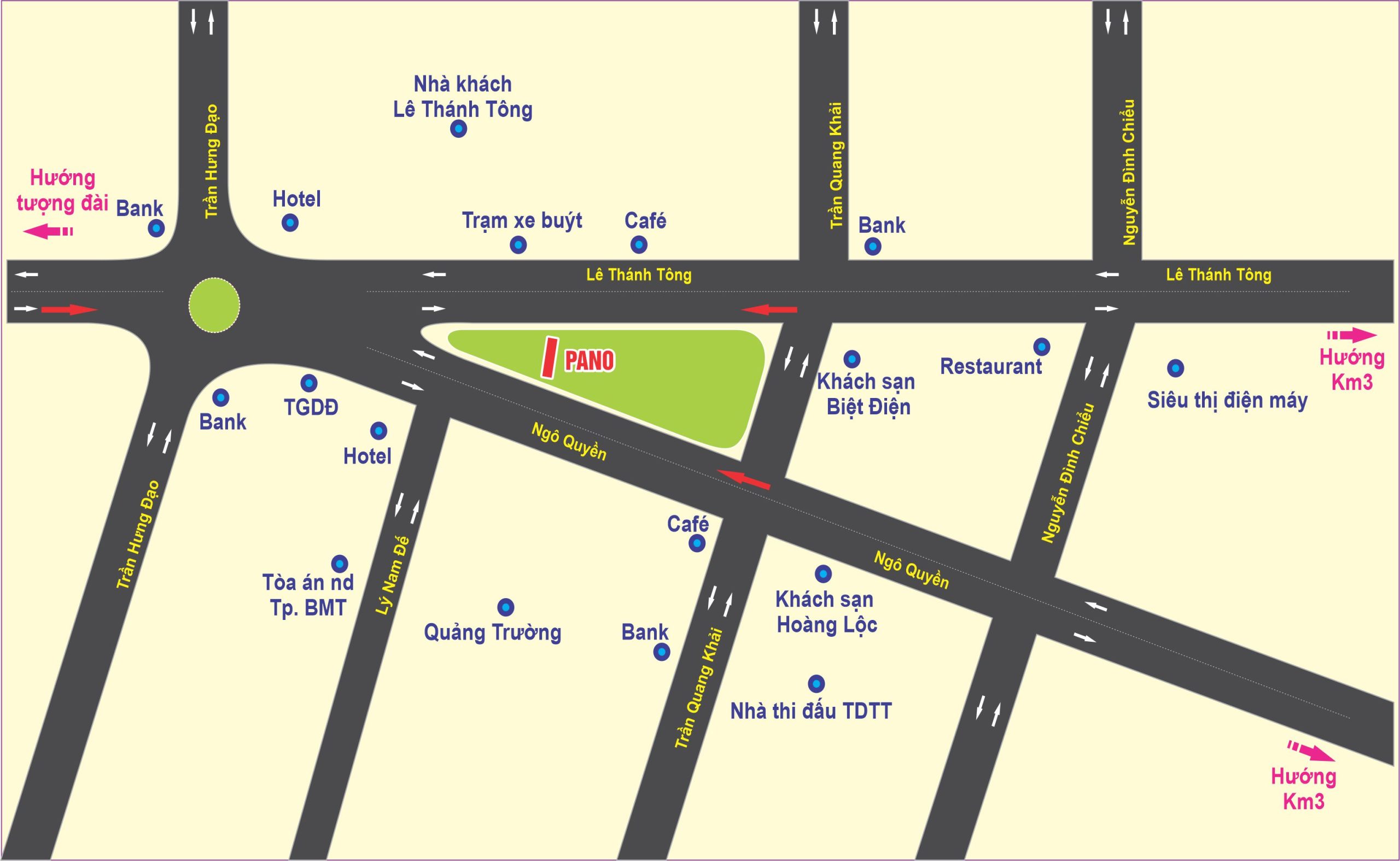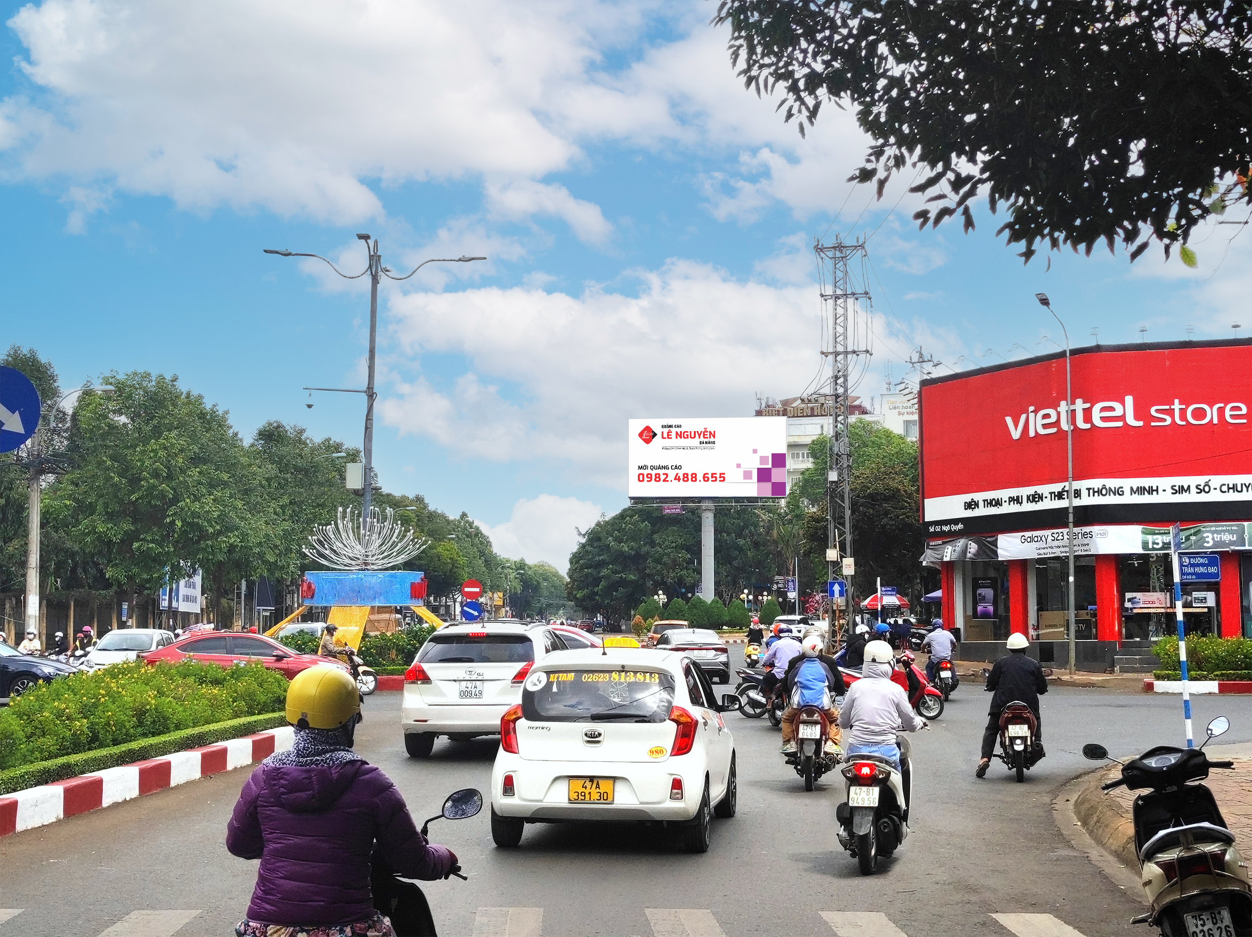 Pano 2 mặt nằm ngay ngã 5 đường Ngô Quyền – Lê Thánh Tông – Trần Hưng Đạo, là nơi giao nhau các tuyến đường chính của Buôn Ma Thuột, nên tập trung rất nhiều xe cộ qua lại. Hiệu quả tiếp cận: với vị trí trung tâm, lưu lượng người đi bộ + xe cộ cao, pano có khả năng tiếp cận tốt đến nhiều đối tượng người xem. Khách lưu trú và khách đi du lịch thường xuyên cũng sẽ nhìn thấy pano trên đường di chuyển tới khách sạn, các điểm tham quan, trung tâm thương mại, ăn uống. Một vị trí lý tưởng để truyền thông quảng bá thương hiệu đến với khách hàng.