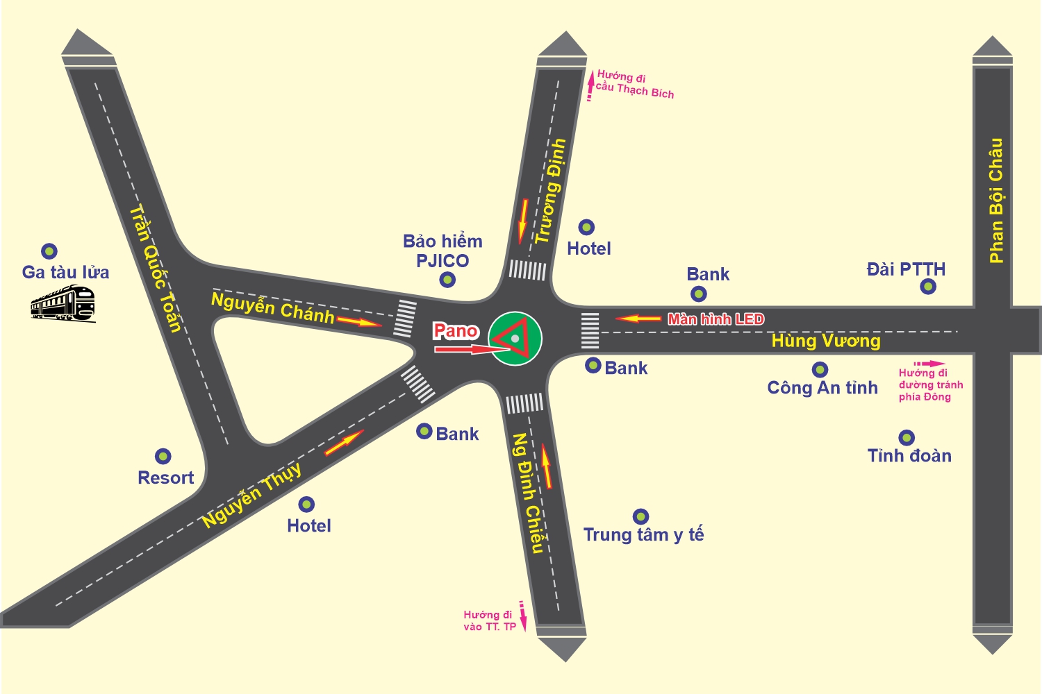 Pano 3 mặt (1 mặt Màn hình LED + 2 mặt bạt Hiflex) được đặt ngay giữa Vòng xuyến Ngã 5 Thu Lộ (Đường Nguyễn Chánh, Nguyễn Thụy, Nguyễn Đình Chiểu, Hùng Vương và Trương Định). Đây là nút giao thông luôn đông đúc cả ngày lẫn đêm. Đối diện pano là quảng trường, xung quanh là nhà hàng, khách sạn, siêu thị, Ga trung tâm Quảng Ngãi… Vị trí Pano nằm ngay điểm giao giữa các tuyến đường, mạng lưới giao thông dày đặc, sầm uất tạo điểm nhấn nổi bật cho sản phẩm quảng cáo tại đây.