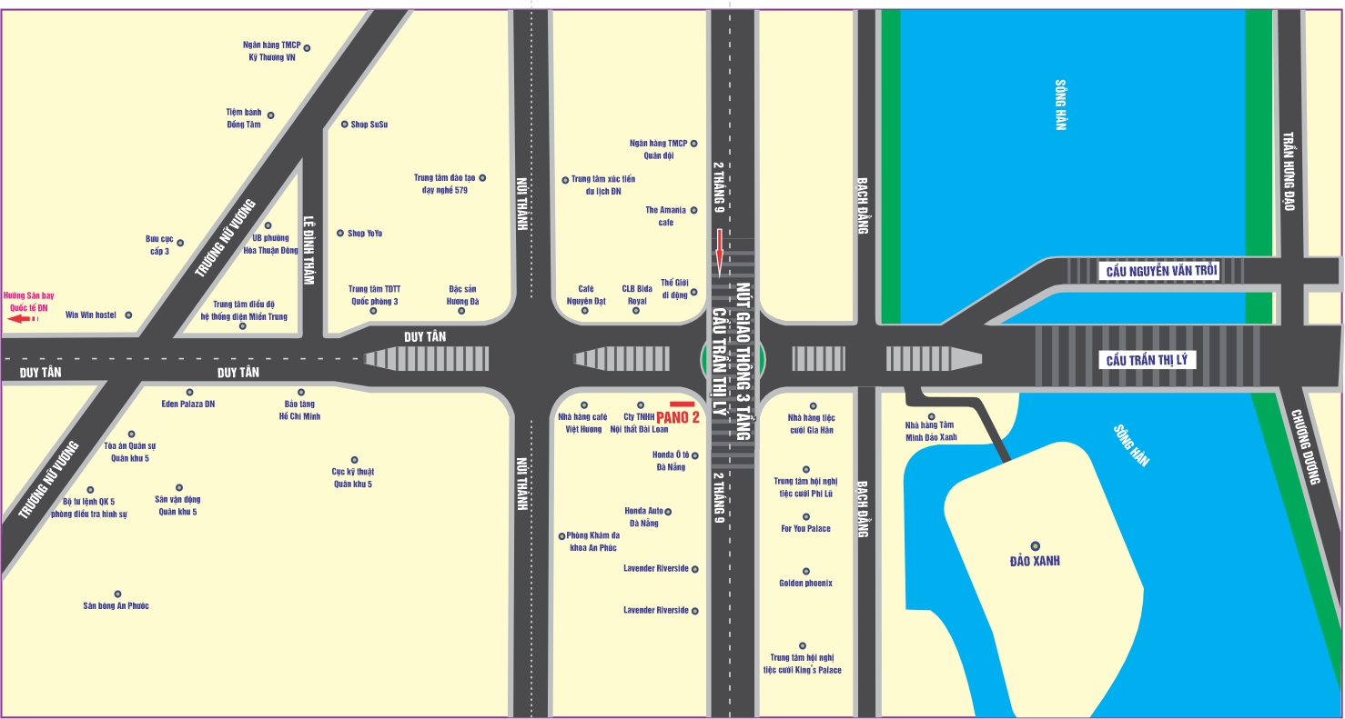Pano nằm ngay ngã tư đường 2 Tháng 9 – Trần Thị Lý, nằm ngay trước vòng xuyến. Pano đón thẳng hướng nhìn của khách từ cầu Trần Thị Lý phía biển đi Sân bay Quốc tế Đà Nẵng, kết hợp với không gian phía trước vòng xuyến ngã 4 lớn – rộng, lưu lượng giao thông qua lại nơi đây rất đông đúc và sầm uất, đón hướng ra vào sân bay. Xung quanh vị trí Pano là các ngân hàng, công viên, nhà hàng, khách sạn 5 sao, tòa nhà cho thuê… nên mật độ qua lại nơi đây rất đông đúc sầm uất nhất thành phố. Cùng với đó là các sự kiện văn hóa, thể thao, du lịch đặc biệt là Lễ hội pháo hoa Đà Nẵng diễn ra hàng năm đón lượng lớn du khách trong nước và quốc tế cùng các sự kiện mang tầm cỡ quốc tế, đón các nguyên thủ quốc gia về đây tham dự, đón lượng người từ các nơi đổ về.
