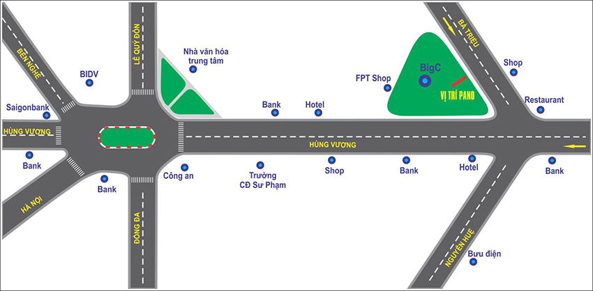 Pano nằm ngay trước mặt Siêu thị Go!, mặt pano hướng về ngã tư đèn xanh đỏ và đồng thời đón dòng khách đi vào ra TP. Huế. Đặc biệt vị trí pano nằm ngay  trung tâm, gần khách sạn, UBND TP, Trường Đại Học … Và đây là nơi có lượng khách rất đông từ các tỉnh thành và thế giới về du lịch, dự Festival Huế hàng năm. Bên cạnh đó pano còn đón dòng khách VIP từ sân bay Huế, Đà Nẵng… Vị trí pano nằm trên các tuyến đường huyết mạch của TP nên lưu lượng giao thông qua lại rất đông đúc, là điểm nhấn cho sản phẩm quảng cao nơi đây.