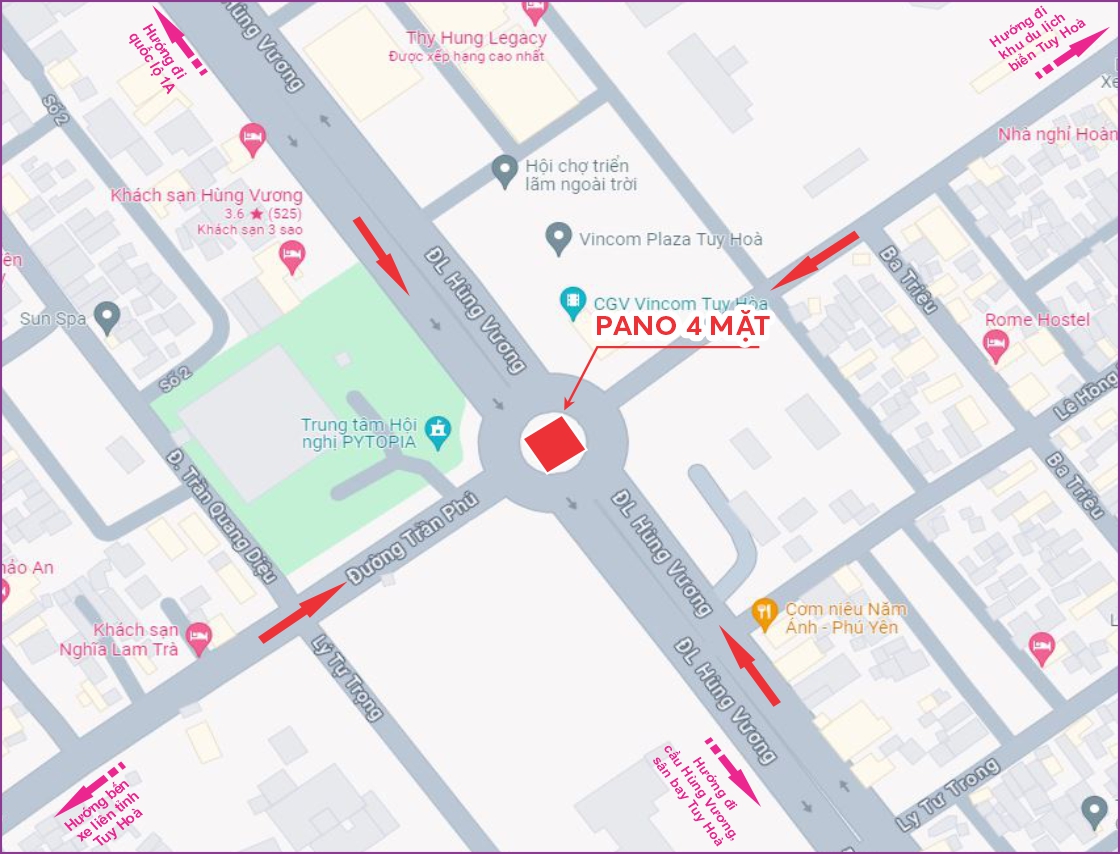 Pano nằm ngay vòng xuyến trung tâm thành phố Tuy Hoà, điểm giao nhau giữa đường Hùng Vương và Trần Phú, trên trục đường Hùng Vương huyết mạch của Tp. Tuy Hoà, và đường Trần Phú dẫn ra khu du lịch biển Tuy Hoà. Xung quanh pano là siêu thị Go!, TTTM Vincom, trung tâm Hội nghị tiệc cưới, trường Đại học Phú Yên, Bệnh viện Y học Cổ truyền vv… Mật độ người và lưu lượng tham gia giao thông tấp nập, rất thích hợp để đưa sản phẩm quảng cáo đến với người tiêu dùng.