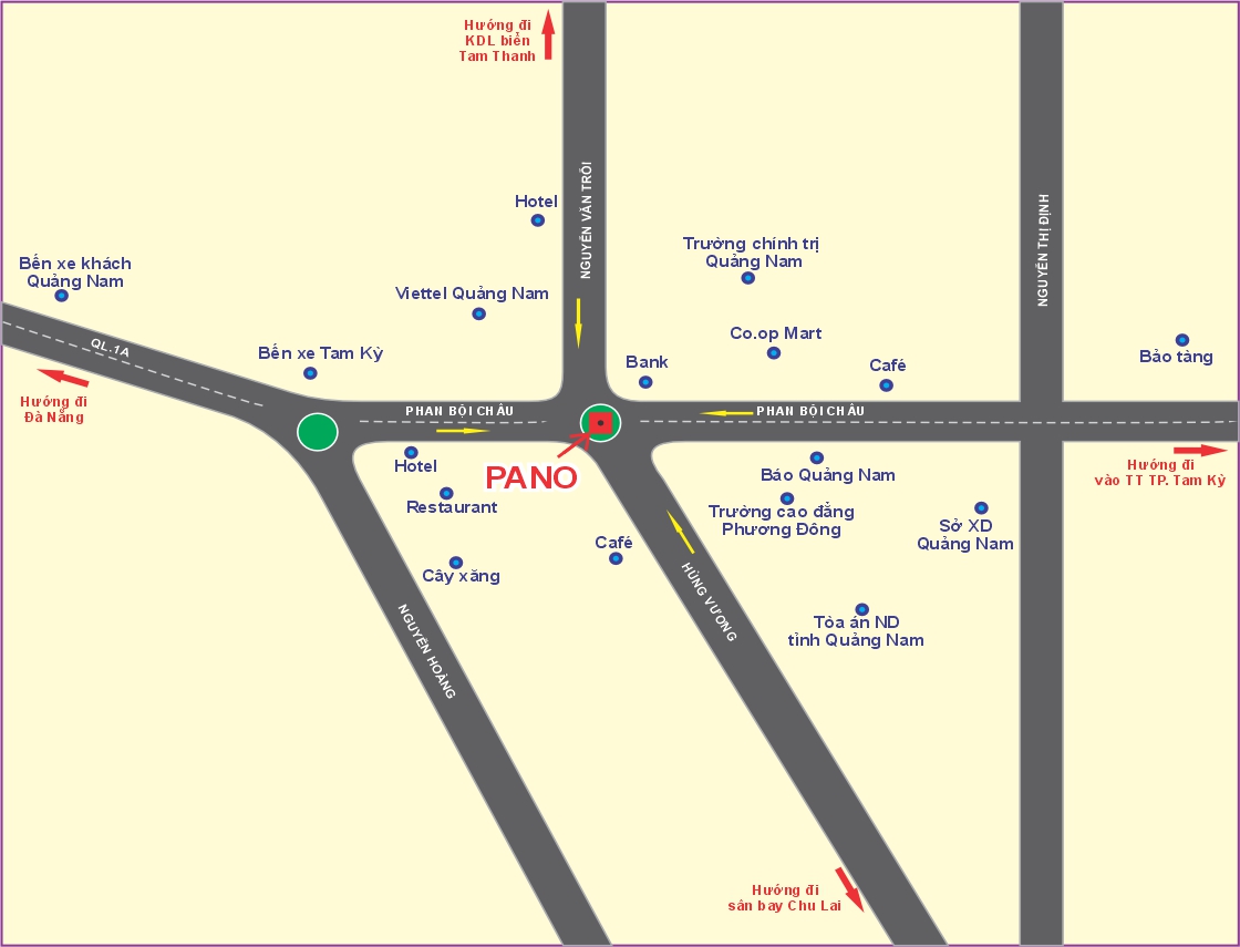 Pano nằm giữa vòng xuyến ngã tư, giao nhau giữa các tuyến đường: Hùng Vương – Nguyễn Văn Trỗi – Phan Bội Châu, là những tuyến đường huyết mạch của Tam Kỳ, là cửa ngõ nối liền ra đường du lịch biển, đi Tượng đài Mẹ Thứ. Tầm nhìn thẳng tim đường cực kỳ đẹp và hoành tráng. Là khu vực trọng điểm vì các tuyến đường Bắc-Nam phải qua nơi này.