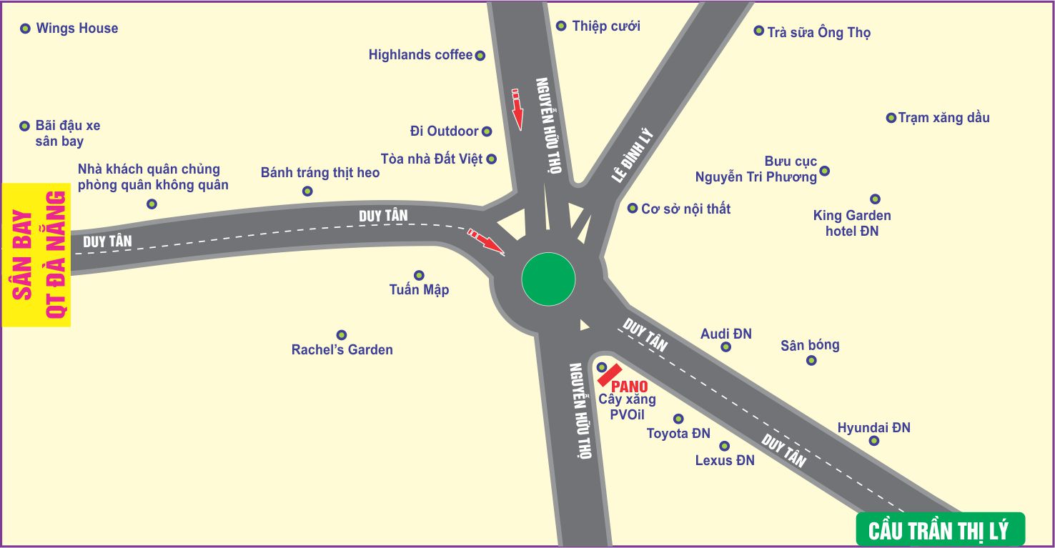 Pano nằm ngay Vòng xuyến Nguyễn Hữu Thọ – Duy Tân, TP. Đà Nẵng, gần cửa ngõ ra vào sân bay Quốc tế Đà Nẵng đón khách Quốc tế và các tỉnh thành khi bước chân đến Đà Nẵng, vị trí này cũng đón khách đi qua cầu Trần Thị Lý, đến các khu resort, villa, bãi biển…Pano nằm trên tuyến đường huyết mạch của thành phố. Xung quanh là các đại lý xe Audi, Toyota Đà Nẵng, Lexus Đà Nẵng, Hyundai Sông Hàn, sân bóng, bệnh viện, trung tâm thể thao, trường học, chợ,… nên lượng người qua lại nơi đây rất đông đúc.