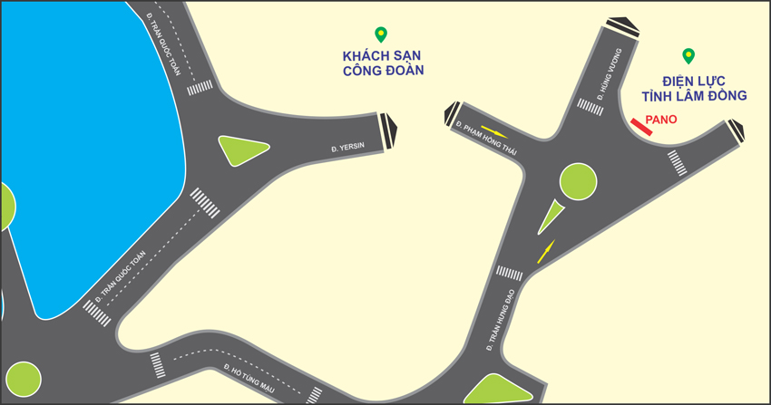 Pano 1 trụ đối diện vòng xuyến ngã 4 Trần Hưng Đạo – Hùng Vương – Khe Sanh – Phạm Hồng Thái, đây là nút giao thông quan trọng của thành phố khi nối liền với các tuyến đường khác tạo nên mật độ giao thông dày đặc. Pano nằm gần Khách sạn 5 sao, bảo tàng tỉnh Lâm Đồng, shop, ngân hàng, trường học, công ty… Nên mật độ người qua lại nơi đây rất đông đúc và sầm uất.