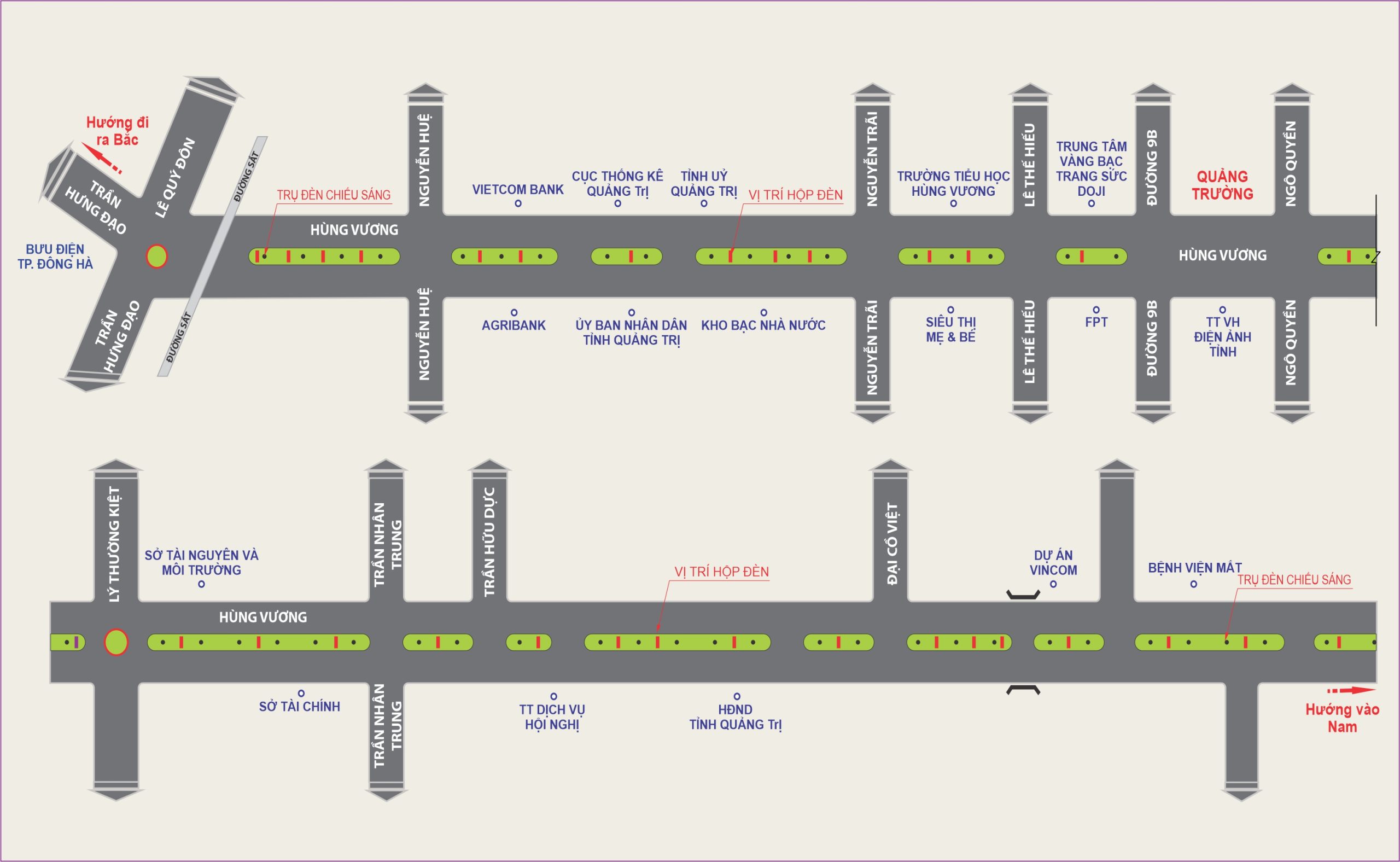 Hộp đèn 2 mặt nằm trên tuyến đường Hùng Vương, Tp. Đông Hà. Là tuyến đường huyết mạch của thành phố, nên tập trung các sở ban ngành, UBND tỉnh, kho bạc nhà nước, Quảng trường, khu đô thị Vin group, shop thời trang, trường học, bưu điện, các nhà hàng, ngân hàng, khách sạn, siêu thị điện máy,… Khu vực này thường xuyên diễn ra các sự kiện lớn. Cùng với đó là các sự kiện văn hóa, thể thao, du lịch diễn ra quanh năm, đón lượng người từ các nơi đổ về. Hộp đèn nằm giữa dải phân cách vừa tầm nhìn, rất thoáng rộng, nhìn thấy từ rất xa, rất hiệu quả cho sản phẩm quảng cáo.