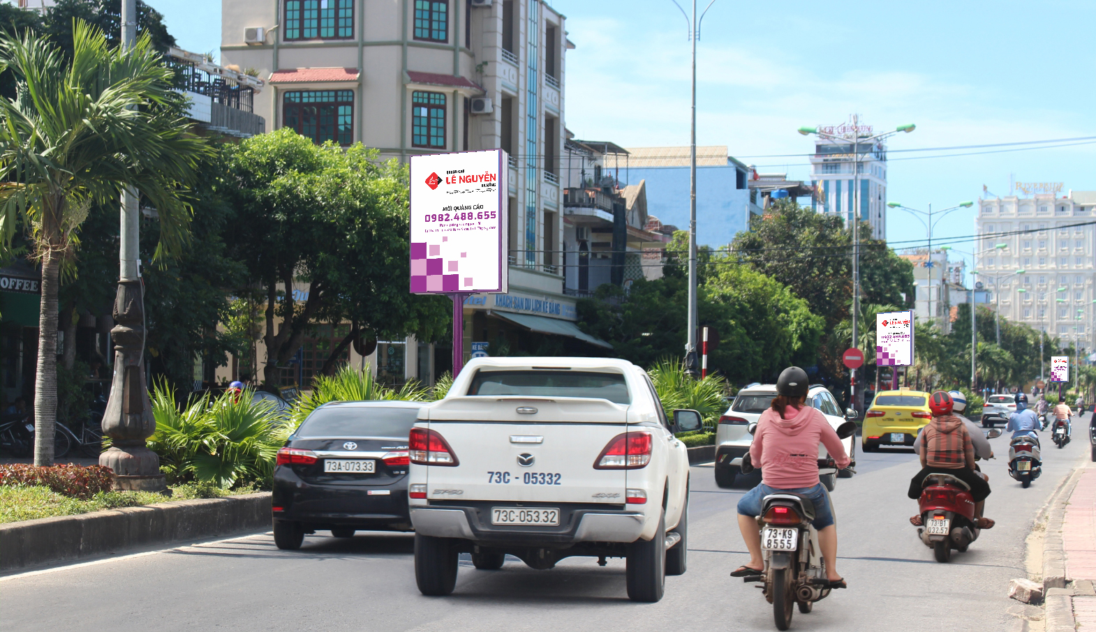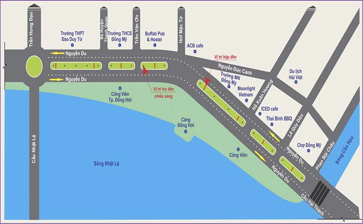 Hộp đèn nằm trên trục đường Nguyễn Du, là tuyến đường khá đông đúc và nổi tiếng của thành phố Đồng Hới. Đây là nơi tập trung của các sở ban ngành, công ty, trường học, đặc biệt nằm bên cạnh cầu Nhật Lệ đón khách du lịch ra biển… Nên lượng người qua lại nơi đây khá đông đúc. Dải phân cách rộng và thoáng nên sản phẩm được quảng cáo rất dễ tạo ấn tượng tốt cho người qua lại.