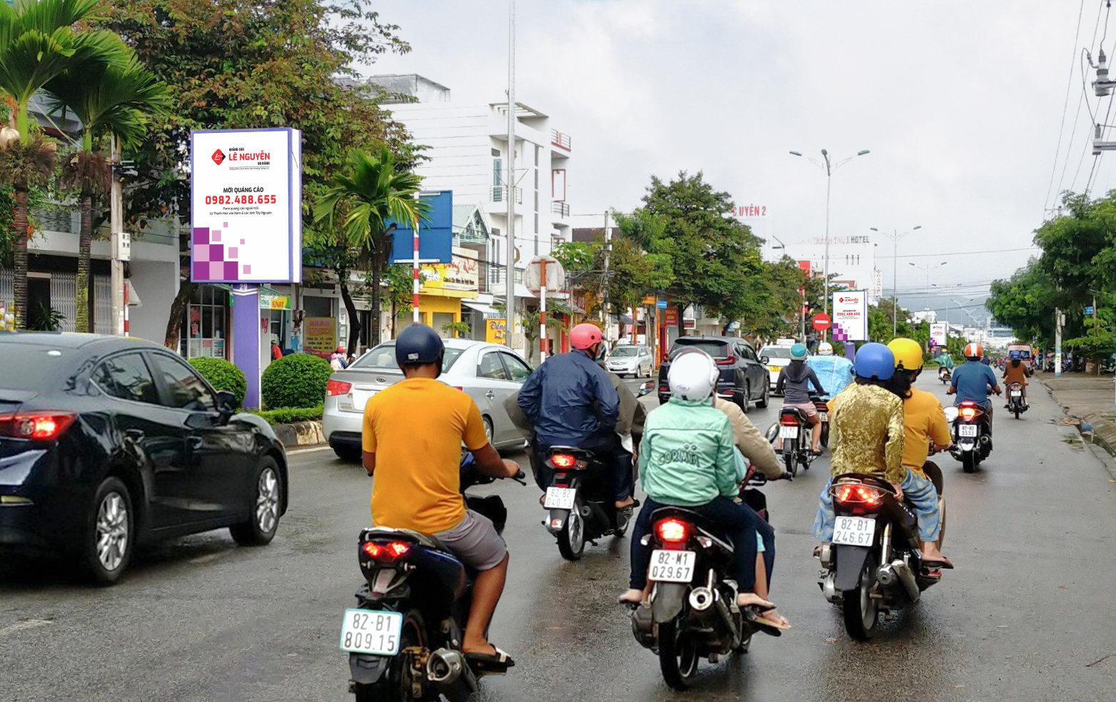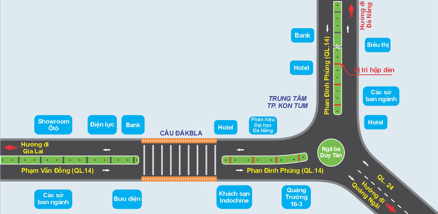 Hộp đèn 2 mặt hướng về hai phía, một mặt đón dòng người từ các tỉnh Tây Nguyên và QL.14B vào TP. Kon Tum qua 2 cầu song song nhau, mặt còn lại đón dòng người từ Tp. Kon Tum hay các tỉnh Quảng Nam, Đà Nẵng, QL.14B qua đây. Tuyến đường Phan Đình Phùng lại nằm trong thành phố nên có rất nhiều người qua lại nơi đây… Các hộp đèn lại cách xa nhau từ 120m – 200m nên rất dễ quan sát và tạo ấn tượng cho người qua lại nơi này.