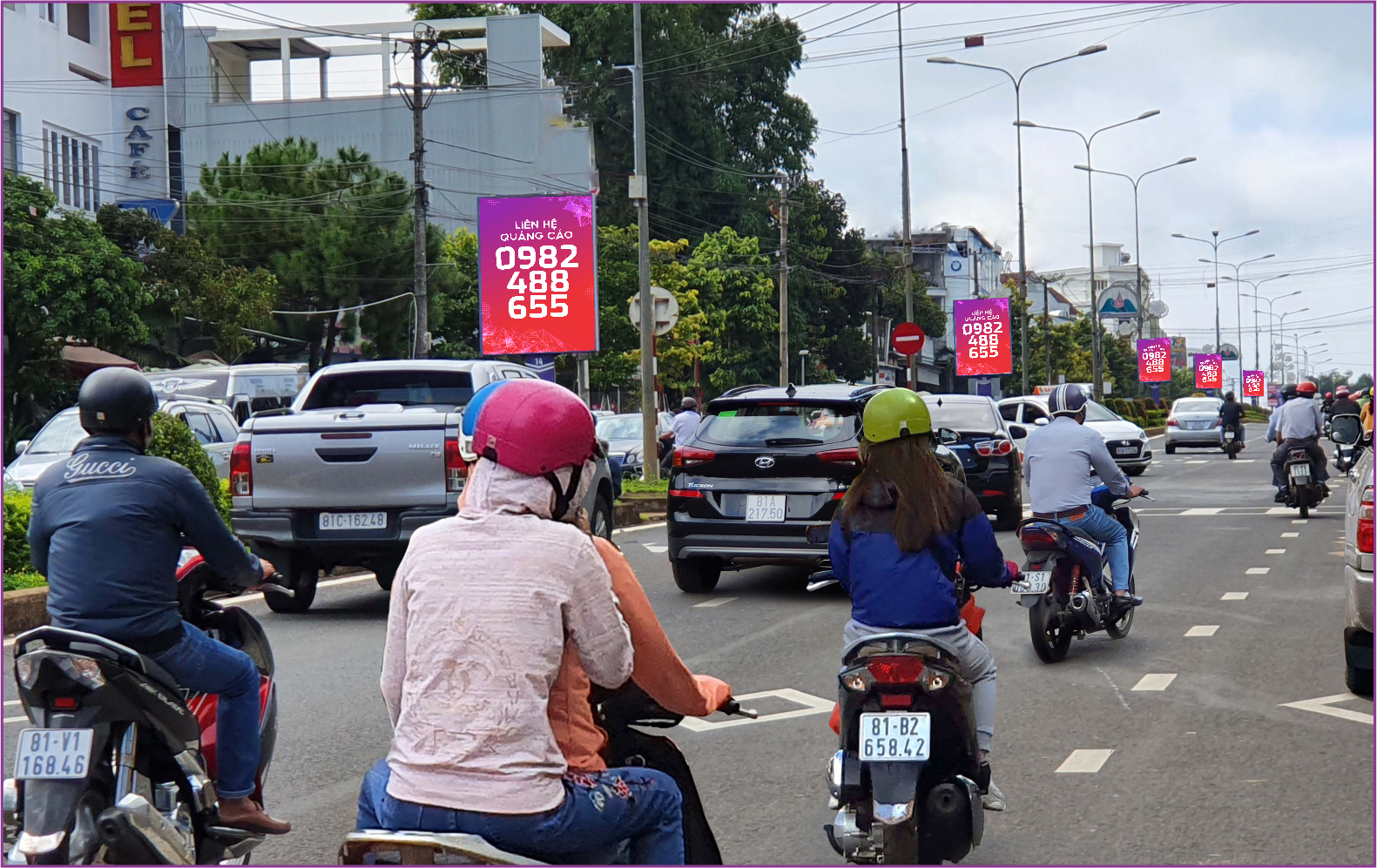 Hộp đèn 2 mặt được đặt giữa dải phân cách đường trung tâm Pleiku, mỗi hộp đèn có khoảng cách từ 120m – 150m, do nằm giữa tuyến đường 2 chiều nên người và xe cơ giới qua lại nhìn khá rõ, vị trí đẹp dễ nhìn thấy từ xa. Đường Nguyễn Tất Thành là con đường to, thoáng, đẹp nhất trung tâm Pleiku, đón các tuyến đi Bắc Nam, QL.14… Nên mật độ qua lại nơi đây rất đông.