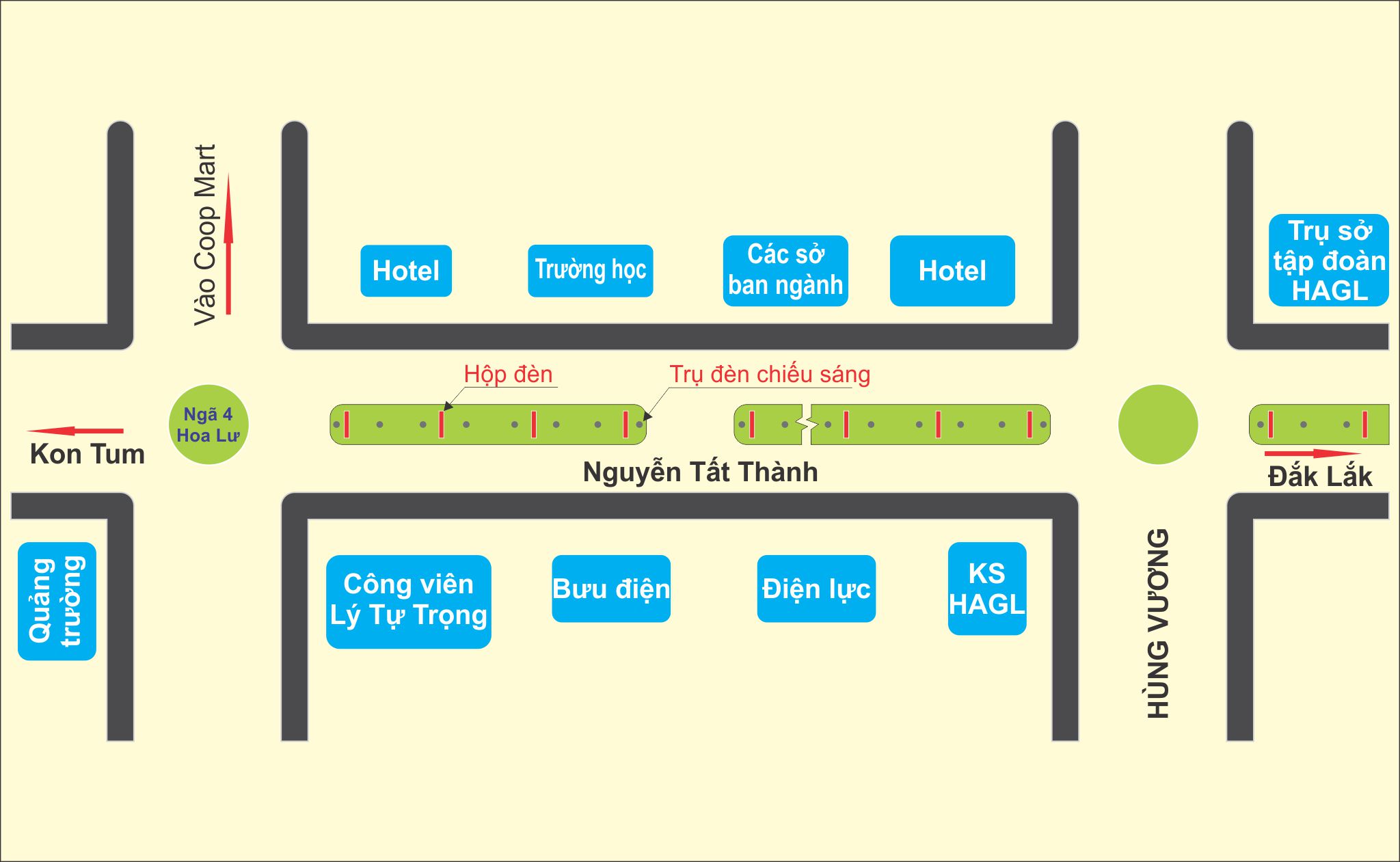 Trụ Hộp Đèn – Dải phân cách Nguyễn Tất Thành, P. Pleiku, Tỉnh Gia Lai